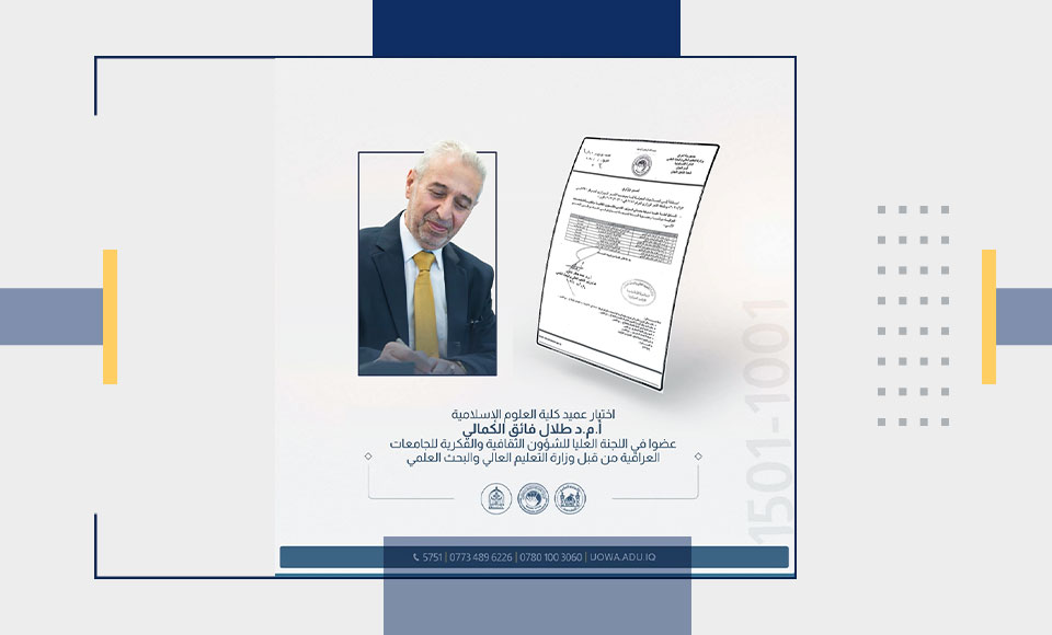 ويذكر أن عميد كلية العلوم الإسلامية، الأستاذ الدكتور طلال الكمالي، قد اختير سابقًا كعضو في هذه اللجنة.