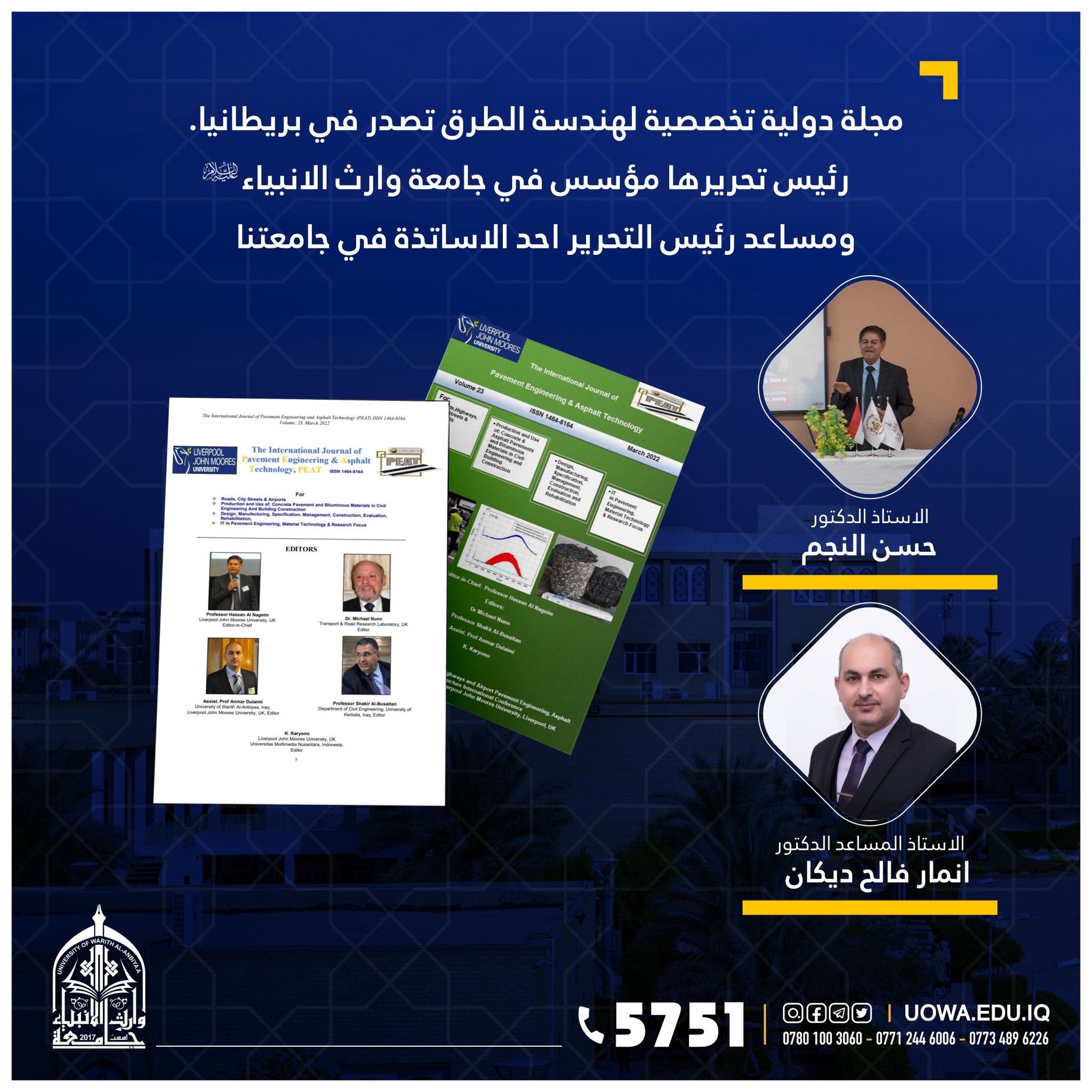 رئيس تحريرها مؤسس في جامعة وارث الانبياء (عليه السلام) ومساعد رئيس التحرير احد الاساتذة في جامعتنا : مجلة دولية تخصصية لهندسة الطرق تصدر في بريطانيا.