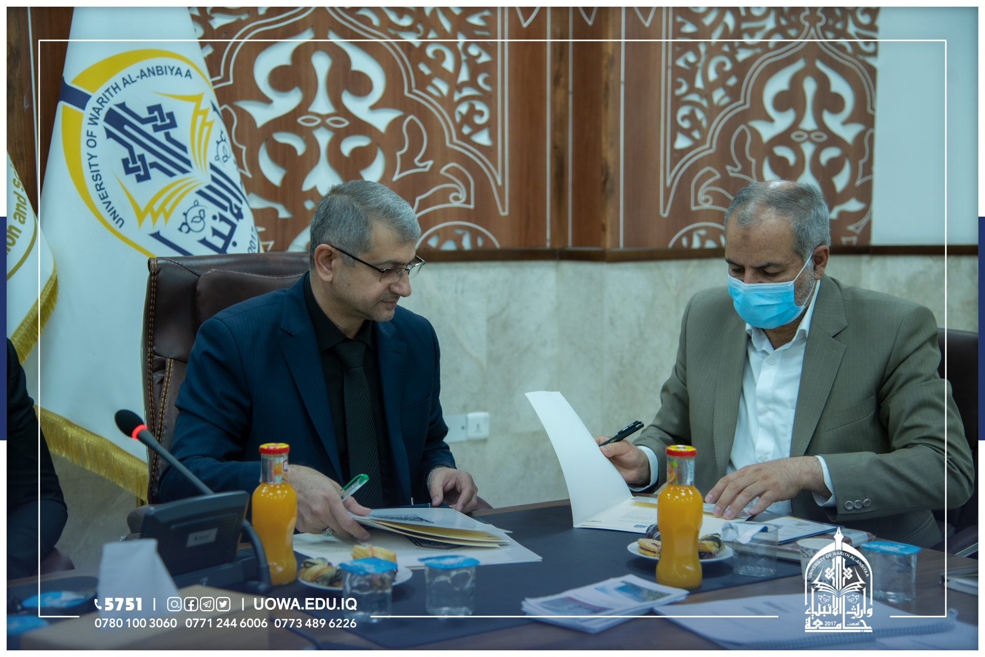 تفعيلاً لبنود الاتفاقية العلمية الموقعة بين جامعتي وارث الانبياء(عليه السلام) ومشهد للعلوم الطبية، استقبلت رئاسة هيئة التعليم الجامعي متمثلة بالاستاذ الدكتور حيدر التميمي ورئاسة الجامعة متمثلة بالاستاذ الدكتور ابراهيم الحياوي والمساعد العلمي الاستاذ الدكتور عباس الدعمي، وفد جامعة مشهد للعلوم الطبية لتنفيذ الاتفاقيات المبرمة بين الجانبين حول تدريبِ الطلبةِ وتنميةِ مهاراتِهِم العلميةِ والعملية في كلية التمريض وكذلك التعاون في مجالات تدريب الطلبة وتبادل الأساتذة المتخصصين فضلاً عن اقامة البحوث المشتركة بين الجانبين".
