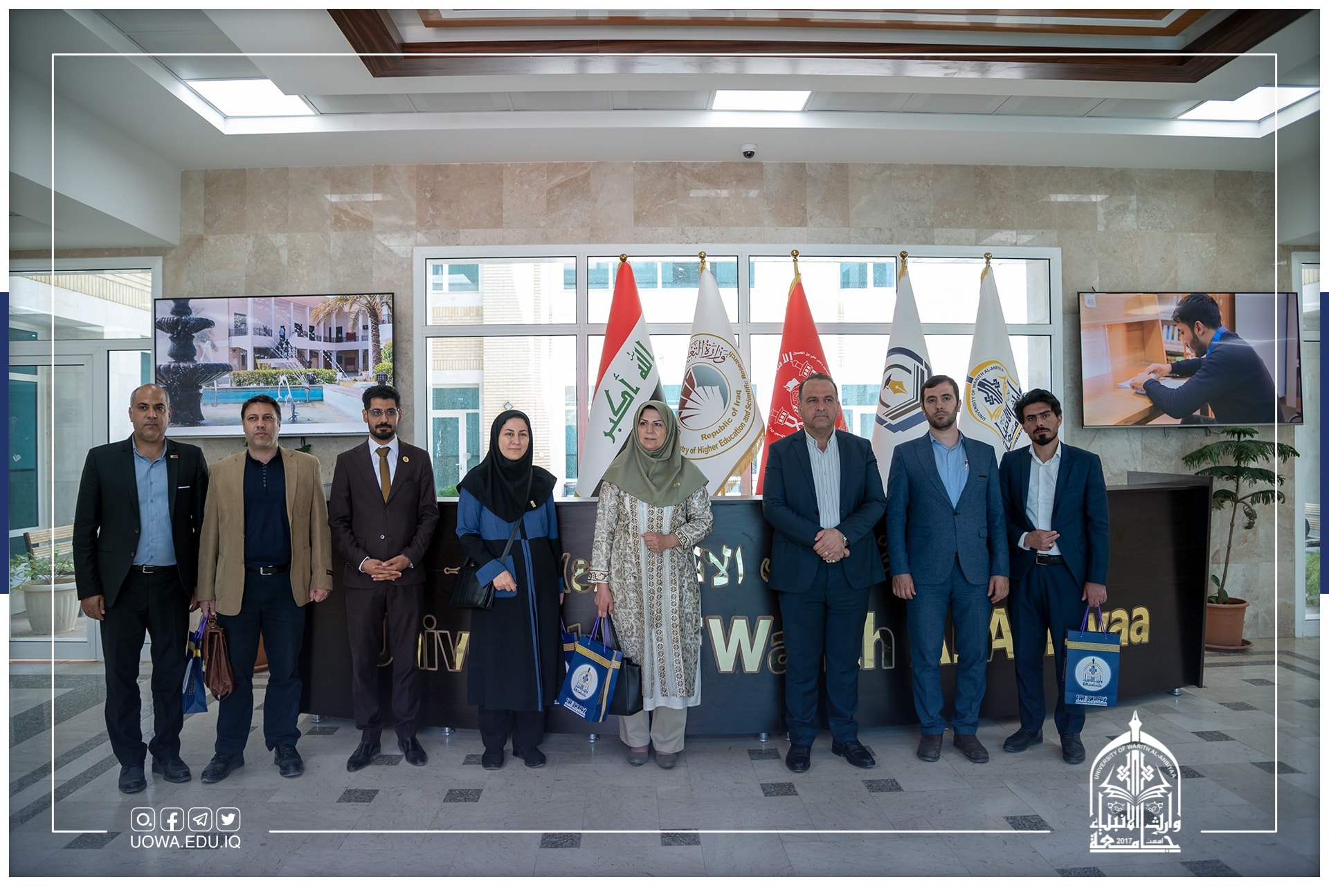 استقبلت جامعة وارث الأنبياء(عليه السلام) وفداً من جامعة طهران/ ايران للاتفاق المبدئي حول عقد مذكرة تعاون علمي بين الجامعتين، واستقبل الوفد السيد رئيس هيأة التعليم الجامعي أ.د. حيدر التميمي ومساعد رئيس الجامعة للشؤون الإدارية أ.د. نوفل الاعرجي.
