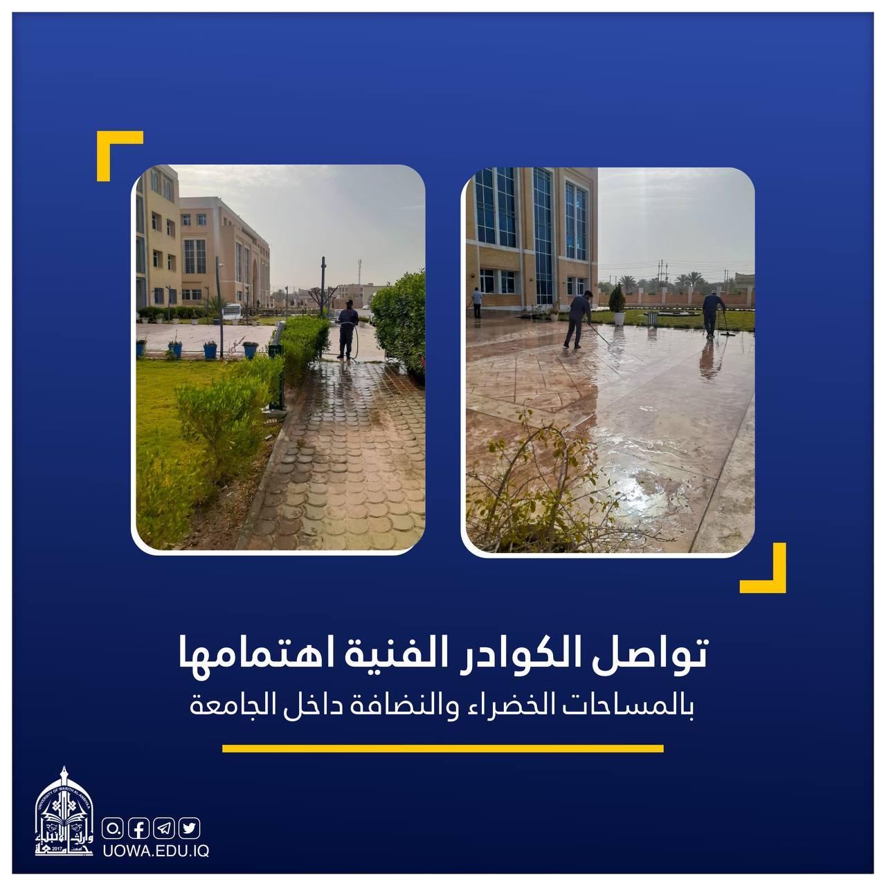 تواصل الملاكات الفنية التابعة للجامعة اهتمامها بالمساحات الخضراء ونظافة الباحات الداخلية والخارجية.