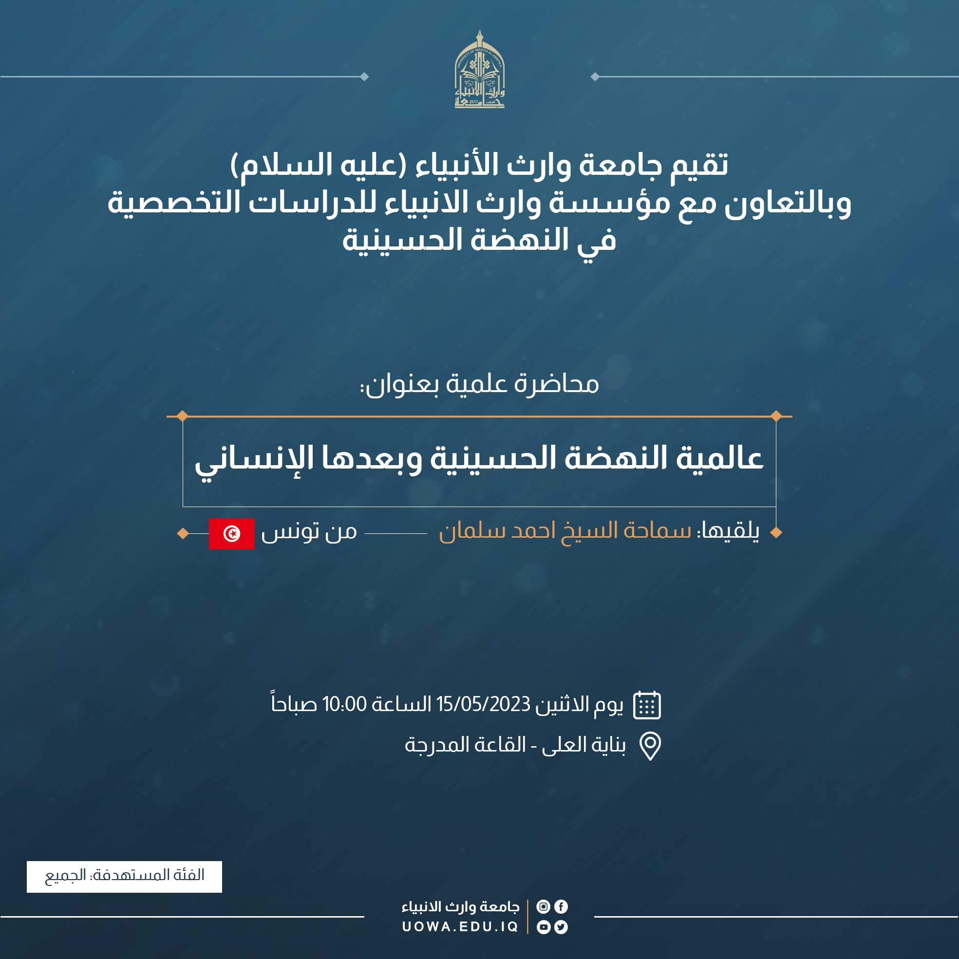 تقيم جامعة وارث الأنبياء (عليه السلام)، وبالتعاون مع مؤسسة وارث للدراسات التخصصية في النهضة الحسينية، محاضرة علمية بعنوان (عالمية النهضة الحسينية وبعدها الانساني).
