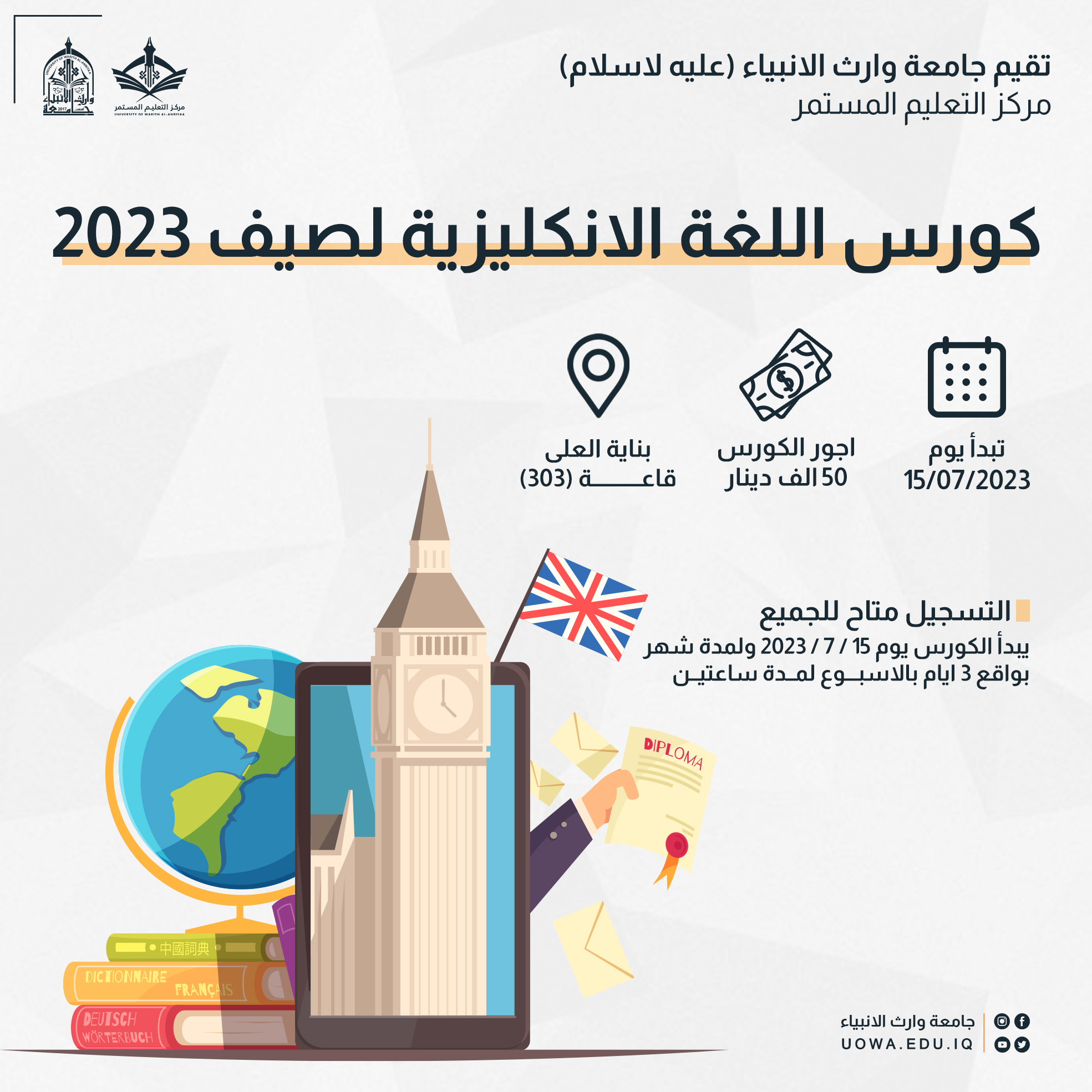 يسر مركز التعليم المستمر في جامعة وارث الانبياء(عليه السلام) أن يعلن عن إقامة كورس اللغة الانكليزية المكثف في العطلة الصيفية و لمدة شهر كامل "English Summer Course"