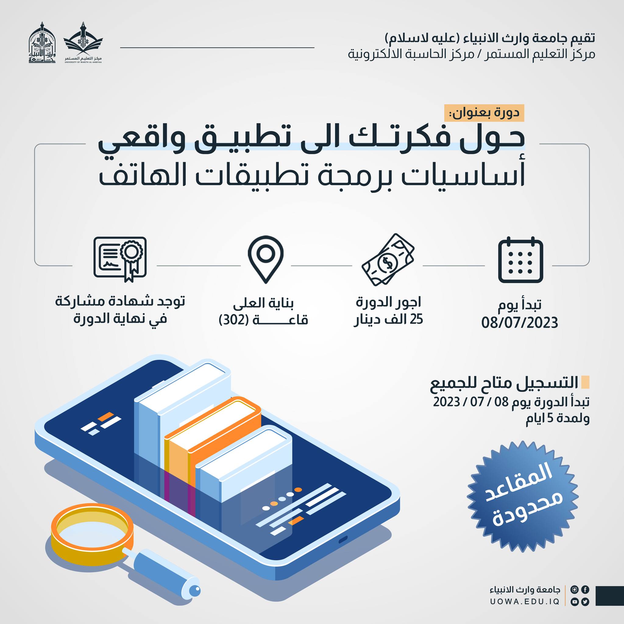 يدعوكم مركز التعليم المستمر في جامعة وارث الانبياء(عليه السلام)، وبالتعاون مع مركز الحاسبة الالكترونية، الى الاشتراك بالدورة التدريبية ( حول فكرتك الى تطبيق واقعي)