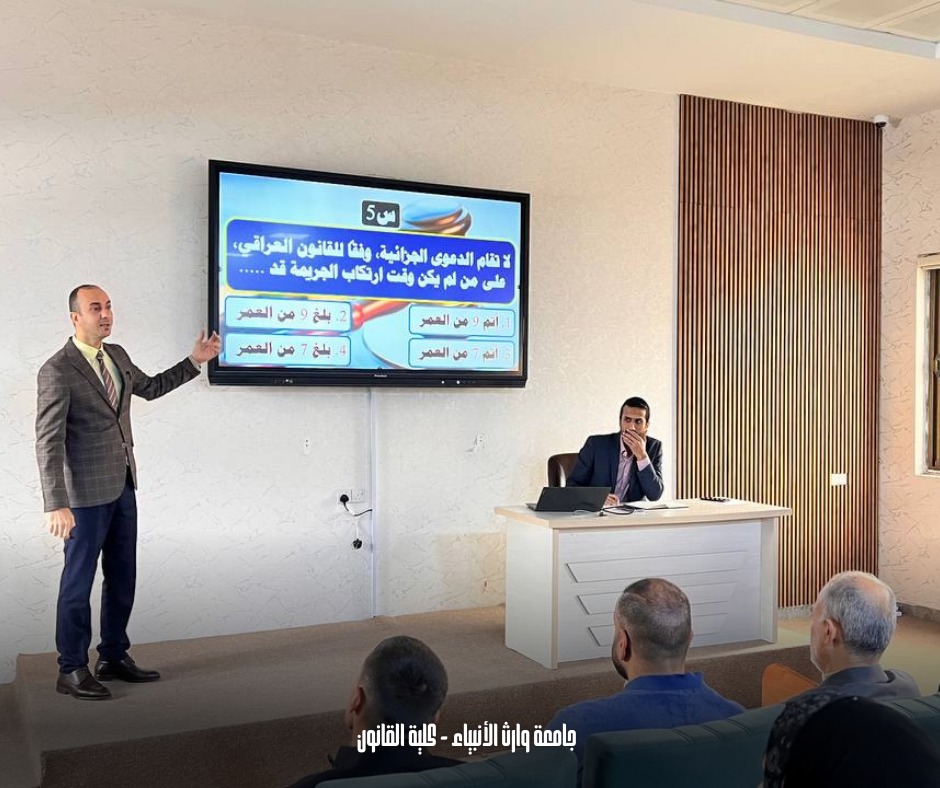 As Part of Enhancing Scientific Engagement and Developing Students’ Academic Skills, the College of Law Recently Organized a Scientific Competition in Criminal Law The event was conducted under the supervision and presentation of Assist. Prof. Dr. Ahmed Jabir and Dr. Hussein Taj. The competition was marked by the outstanding participation of students who demonstrated a high level of understanding and analytical ability in the field, contributing to a vibrant academic atmosphere filled with constructive competition.The event also witnessed broad academic and student attendance, providing an opportunity for the exchange of ideas and perspectives among all participants.