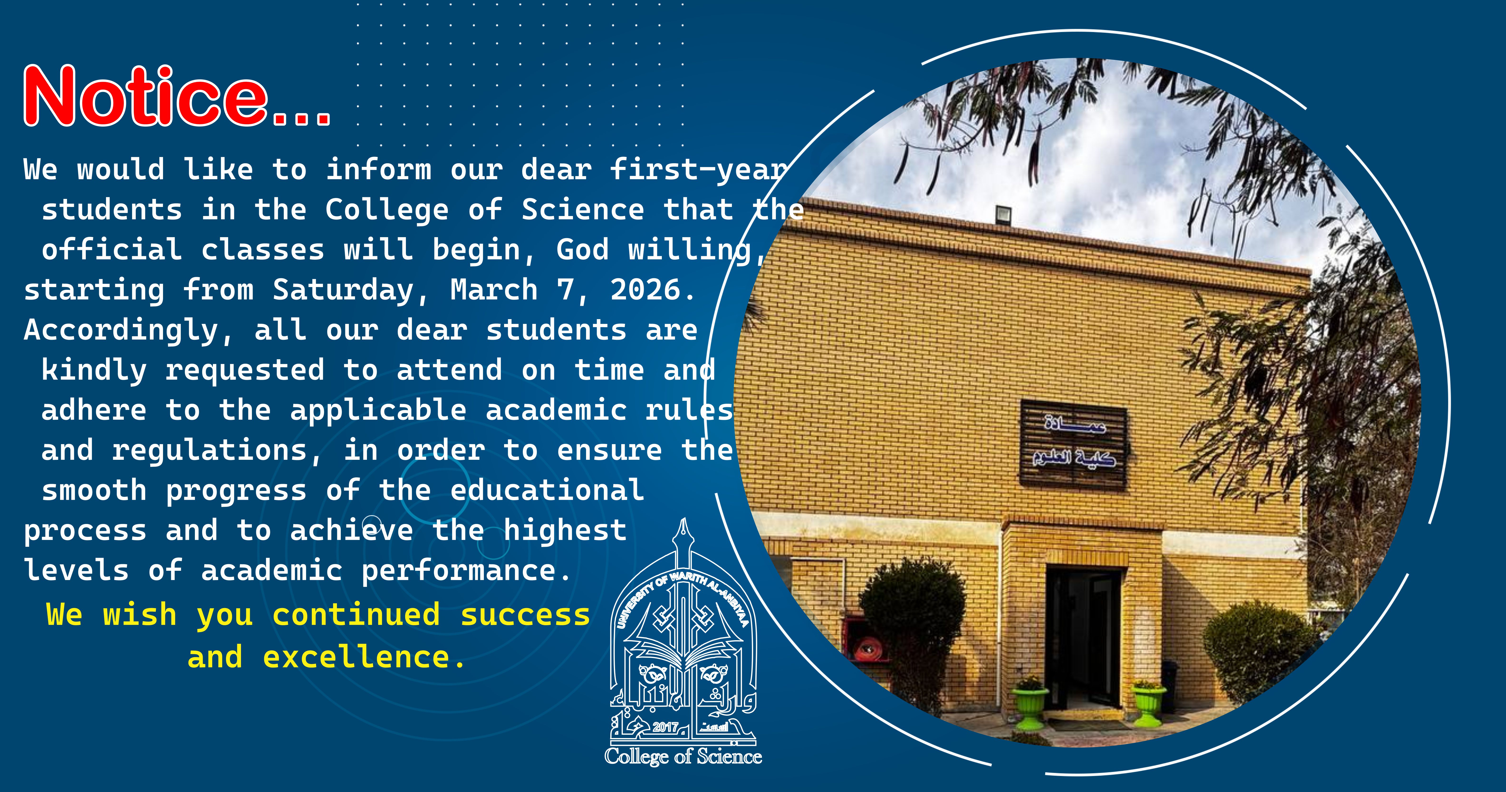 We would like to inform our dear first-year students in the College of Science that the official classes will begin, God willing, starting from Saturday, March 7, 2026. Accordingly, all our dear students are kindly requested to attend on time and adhere to the applicable academic rules and regulations, in order to ensure the smooth progress of the educational process and to achieve the highest levels of academic performance. We wish you continued success and excellence.