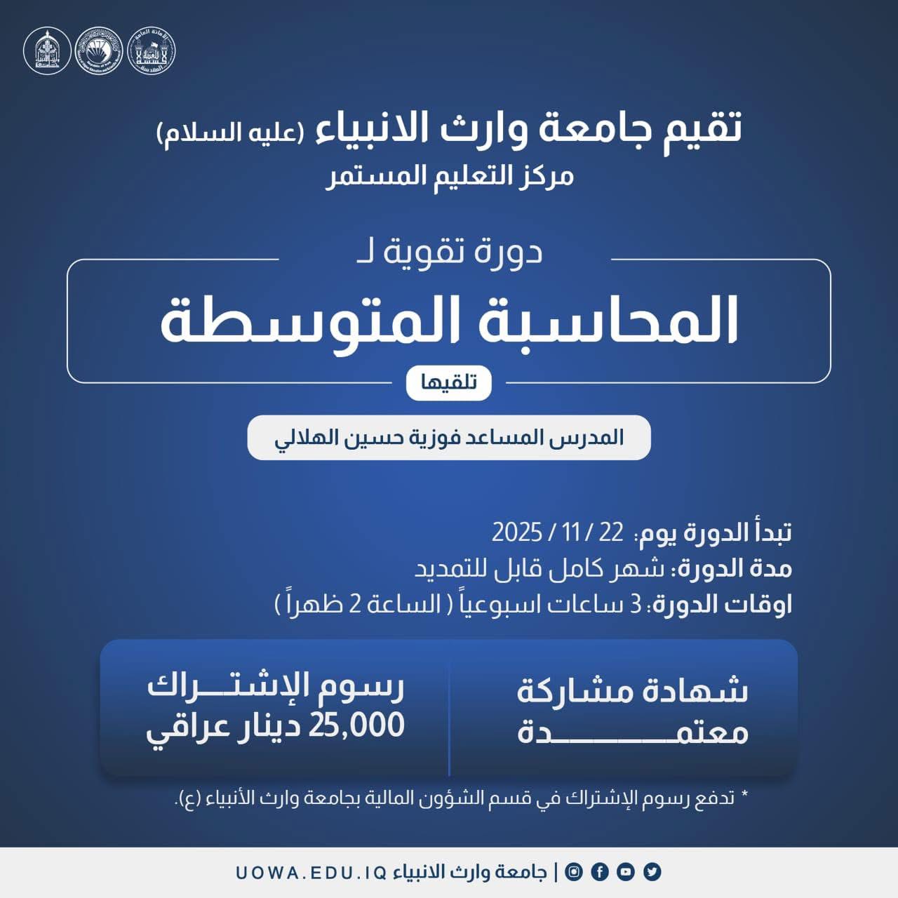 The Continuing Education Center at Warith Al-Anbiyaa University is pleased to announce the continuation of registration for the Intermediate Accounting Reinforcement Course.