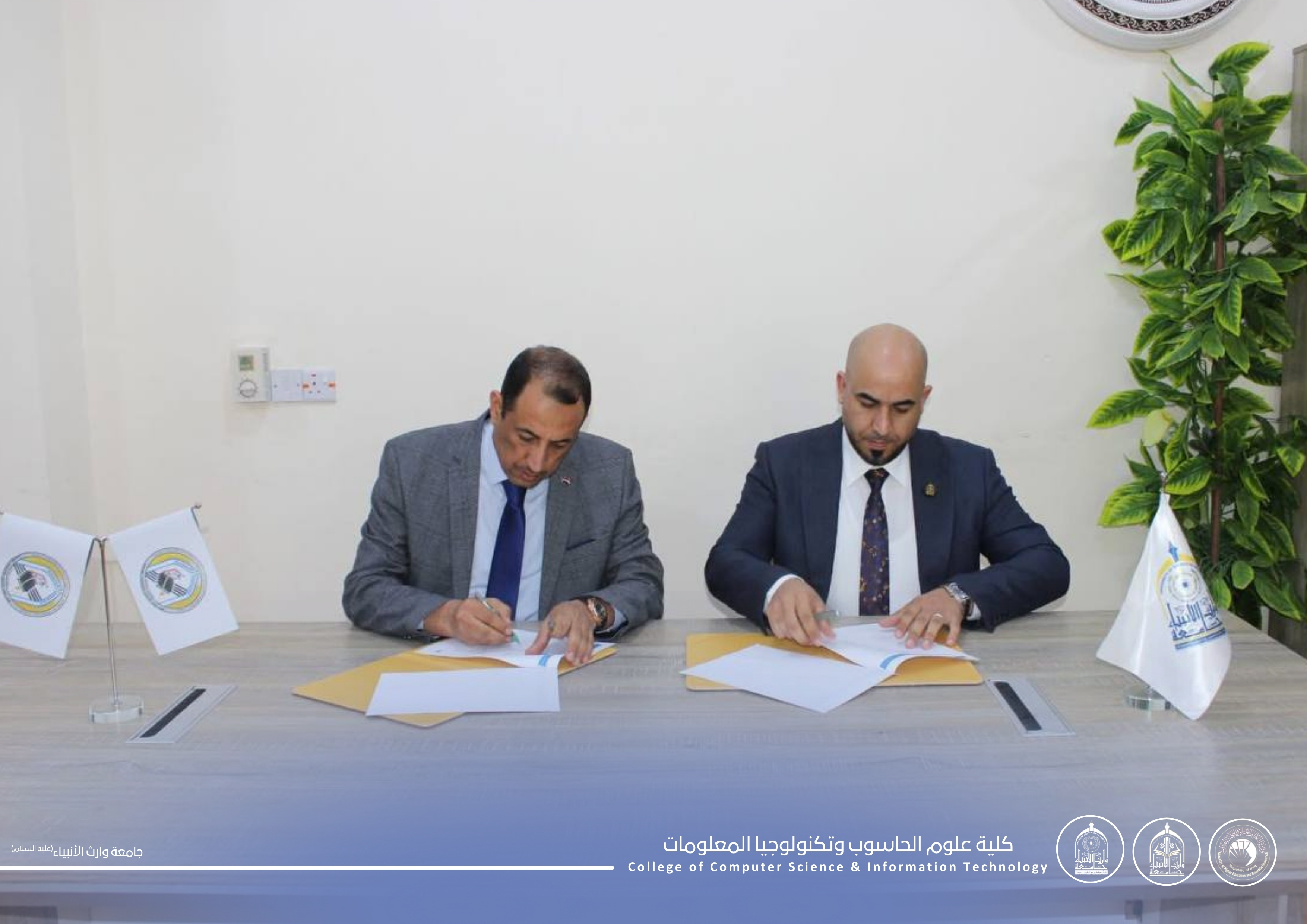 Within the framework of strengthening academic cooperation and exchanging scientific expertise, Assistant Professor Dr. Haider Mohammed Ali Al-Ghanimi, Dean of the College of Computer Science and Information Technology at the University of Warith Al-Anbiyaa (peace be upon him), signed a scientific twinning agreement with Professor Dr. Salah Awwad Salman Al-Issawi, Dean of the College of Computer Science and Information Technology at the University of Anbar.