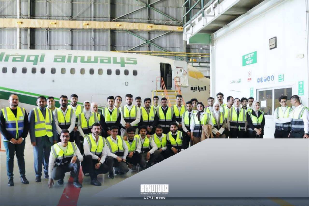 The visit included a comprehensive tour of the various sections of the airport, with a focus on the Iraqi Airways website. The students learned about non-destructive maintenance (NDT) lines for aircraft parts, engine and wheel system maintenance lines, in addition to other details related to aircraft maintenance.