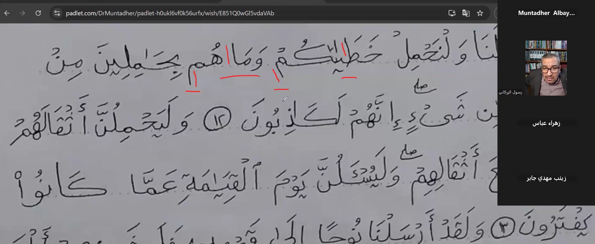 Within the framework of the "Words of Light" project for writing the Holy Quran, the College of Islamic Sciences at the University of Warith Al-Anbiya held the third workshop on Saturday, January 25, 2025, at ten in the morning, via the Zoom platform, in the presence of calligrapher Dr. Rasool Al-Zarkani, President of the Calligraphers Association in Babylon.