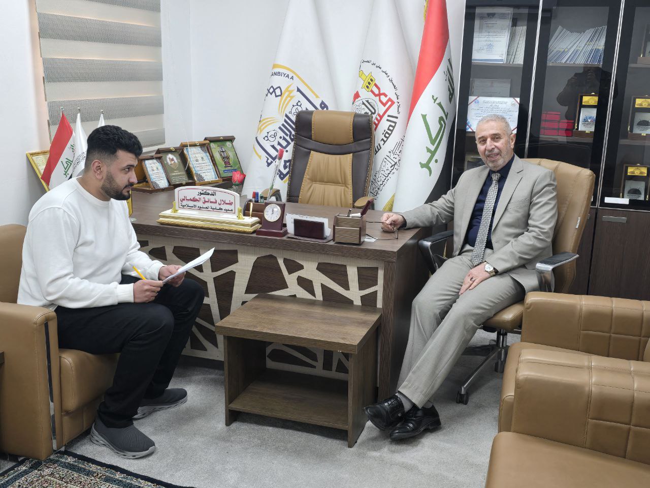 As part of his keenness to enhance communication with students and encourage them to achieve academic excellence, Dr. Talal Faeq Al-Kamali, Dean of the College of Islamic Sciences at Warith Al-Anbiya University, met a student from the College of Media on Monday.