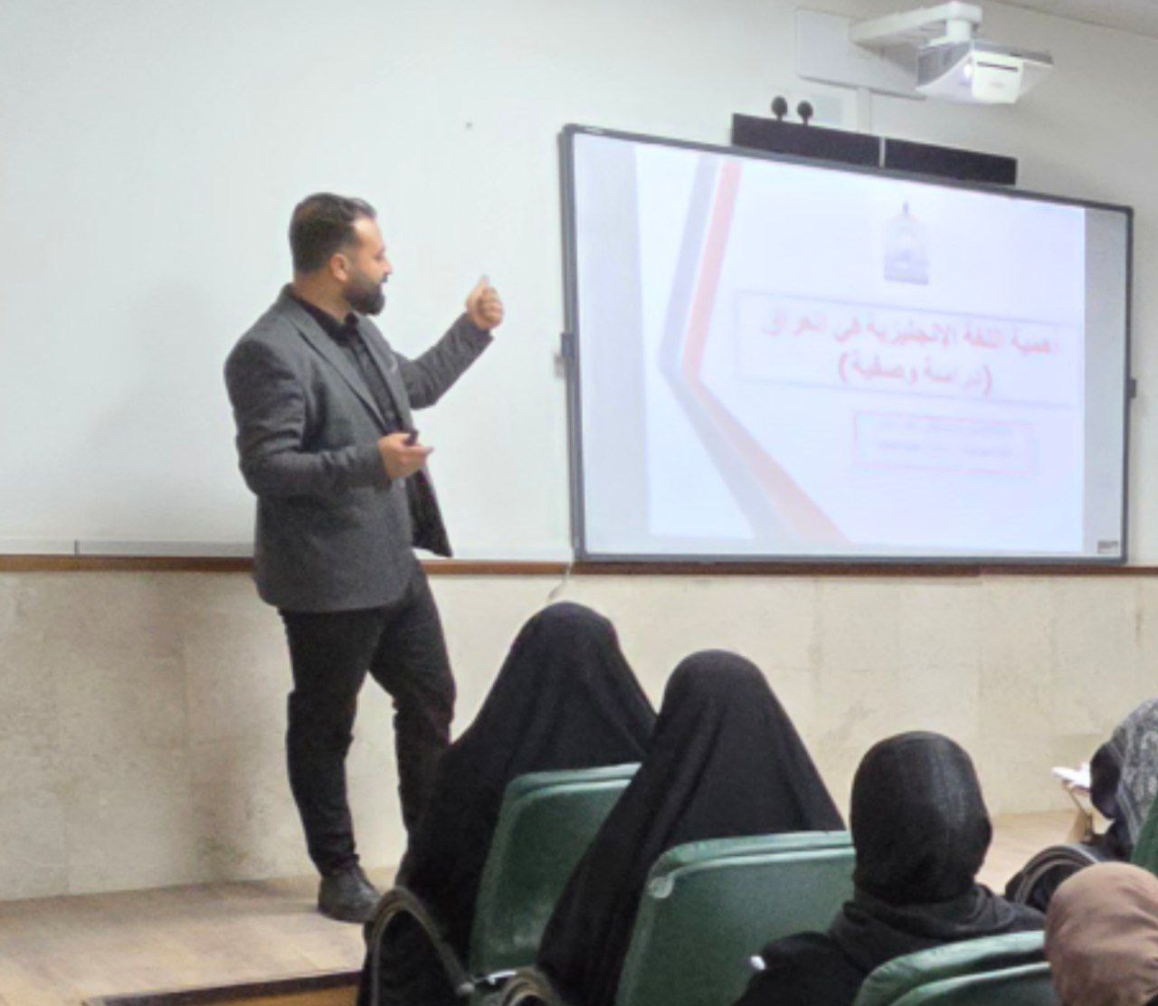 The College of Islamic Sciences held a scientific symposium titled "The Importance of the English Language in Iraq: A Descriptive Study," presented by Lecturer Mustafa Riyadh Al-Khafaji. The symposium explored the role of the English language in higher education, the job market, and international communication.