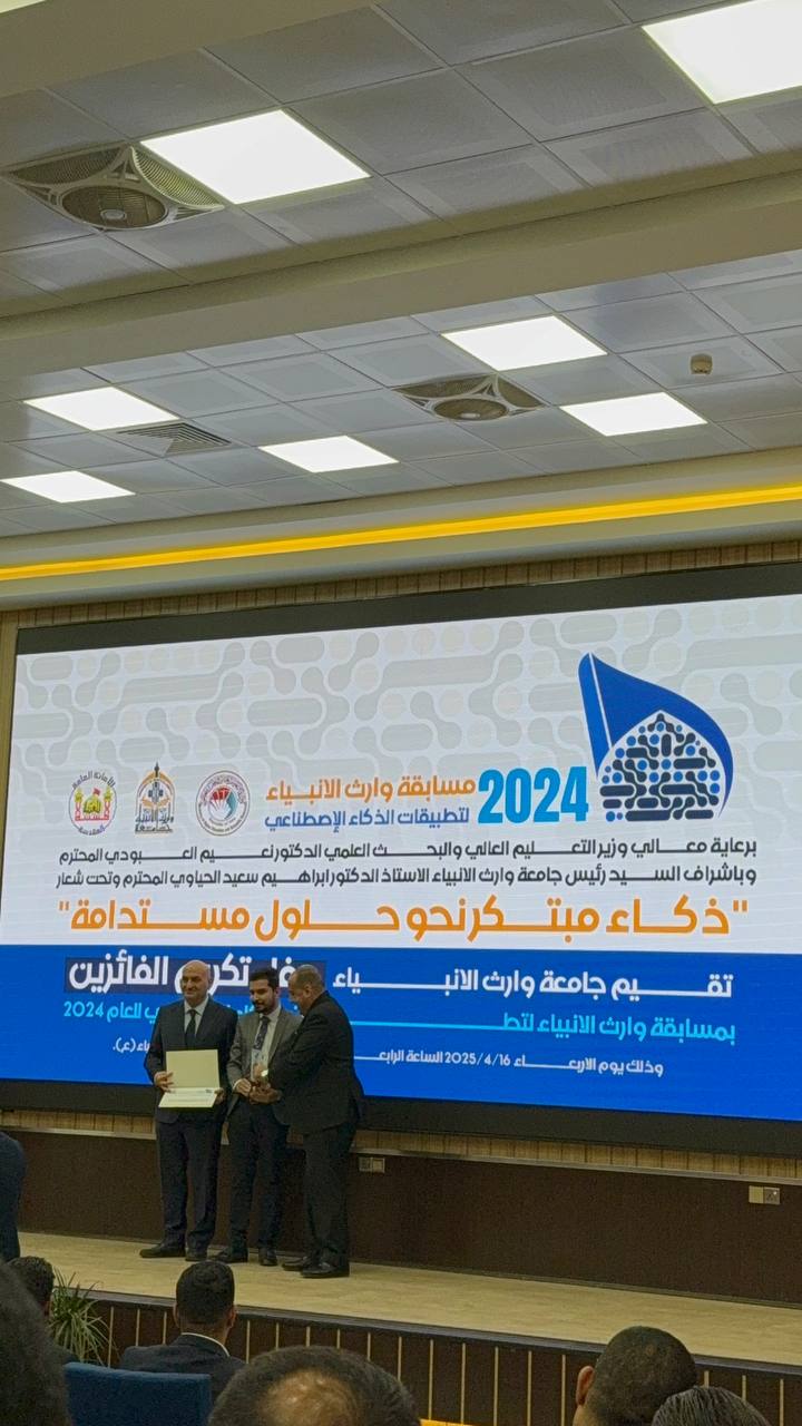 Dr. Ali Kareem, a faculty member at the College of Islamic Sciences, secured third place in the Artificial Intelligence Applications Competition organized by the University of Warith Al-Anbiyaa, which featured the participation of a distinguished group of researchers and programmers.