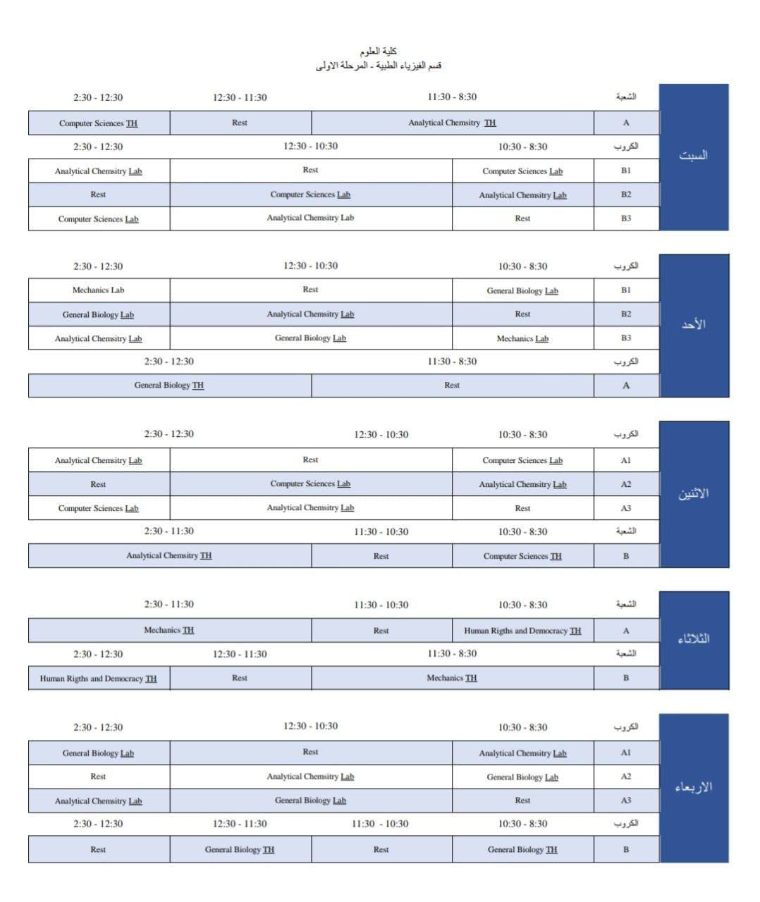 Weekly Schedule for First Year Students in the Information Technology Department