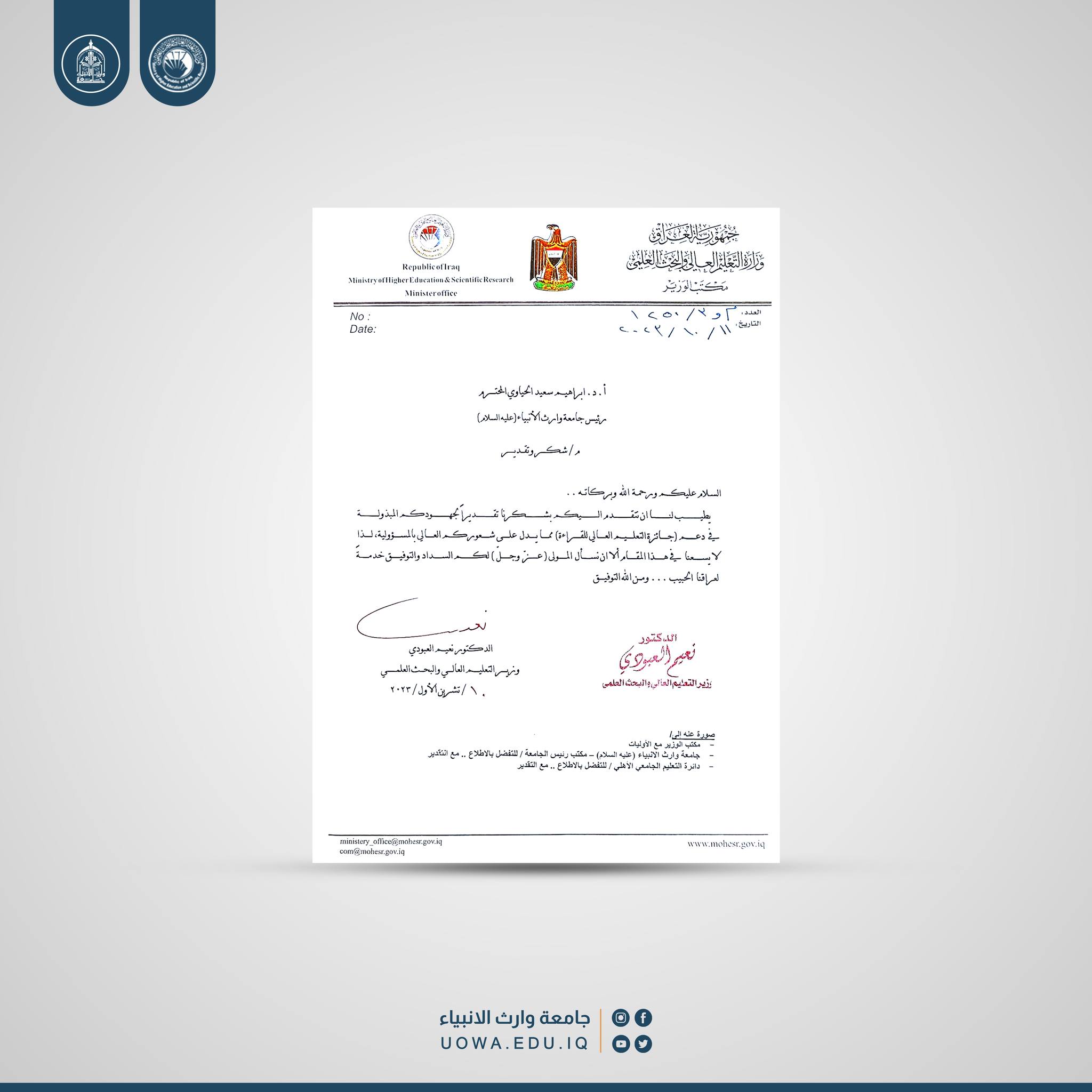 The Minister of Higher Education and Scientific Research honors the University of Warith Al-Anbiyaa (peace be upon him), Dr. Na'im Al-Obaidi, presented a "Letter of Appreciation" to Professor Dr. Ibrahim Al-Hayawi, the university's president, for his efforts in supporting the "Higher Education Reading Award."